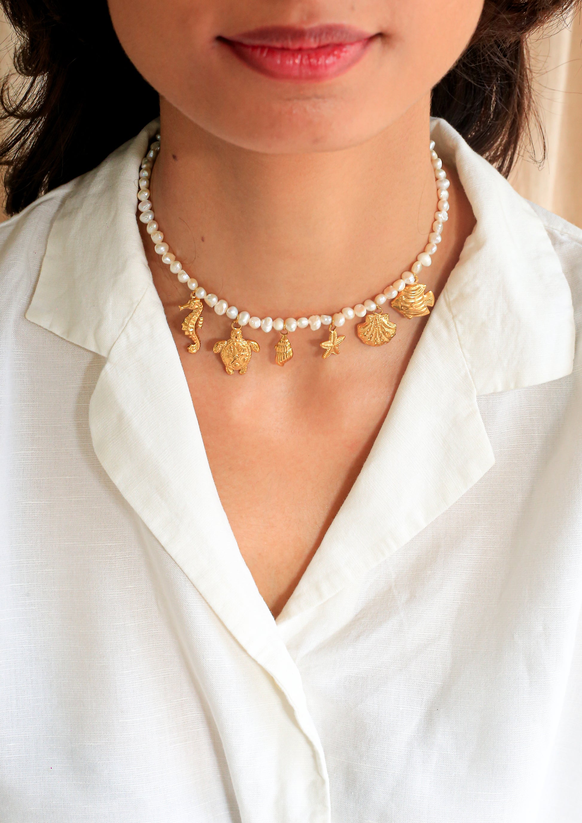 A whimsical ocean-inspired freshwater pearl necklace adorned with six sea-themed charms—a seahorse, turtle, shell, starfish, and fish. Gold stainless steel findings complete this under-the-sea treasure.