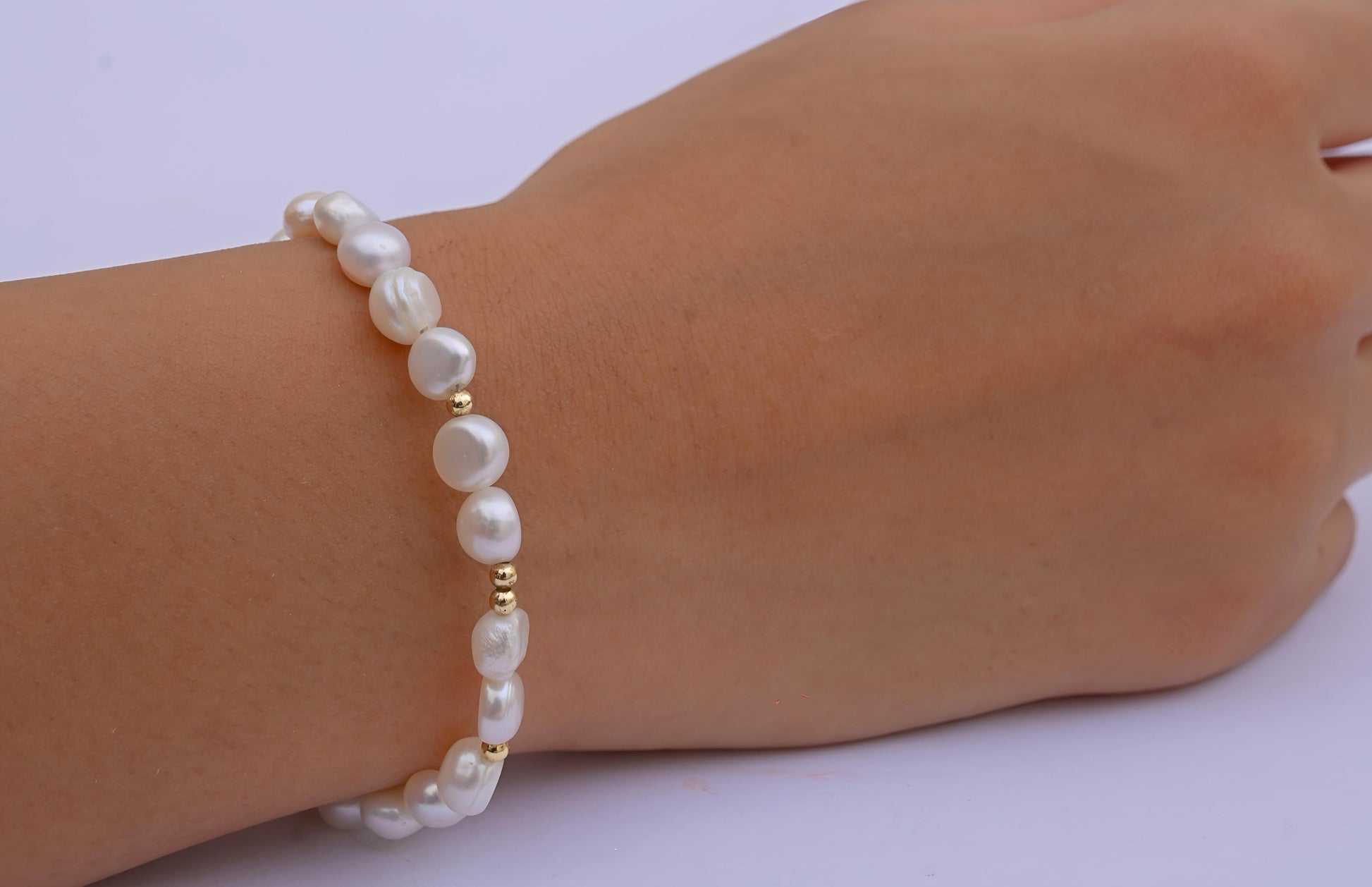 A timeless bracelet/necklace featuring freshwater pearls and gold-toned stainless steel findings. Elegant and delicate, it’s tarnish-free — just handle with care.