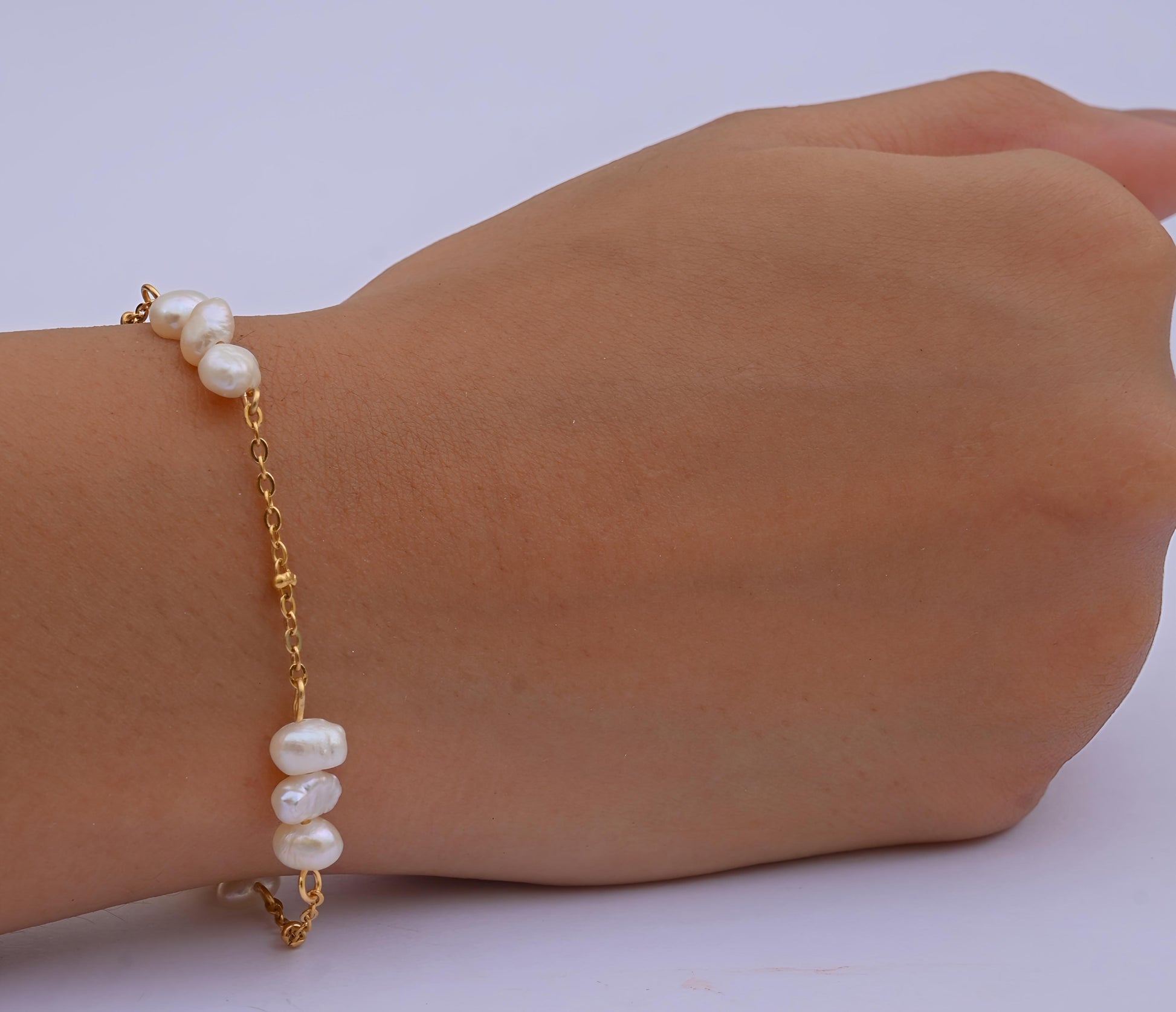 This elegant bracelet/necklace features a pattern of three pearls separated by fine gold-colored stainless steel chains. Thoughtfully designed, it’s tarnish-free — best worn with care.