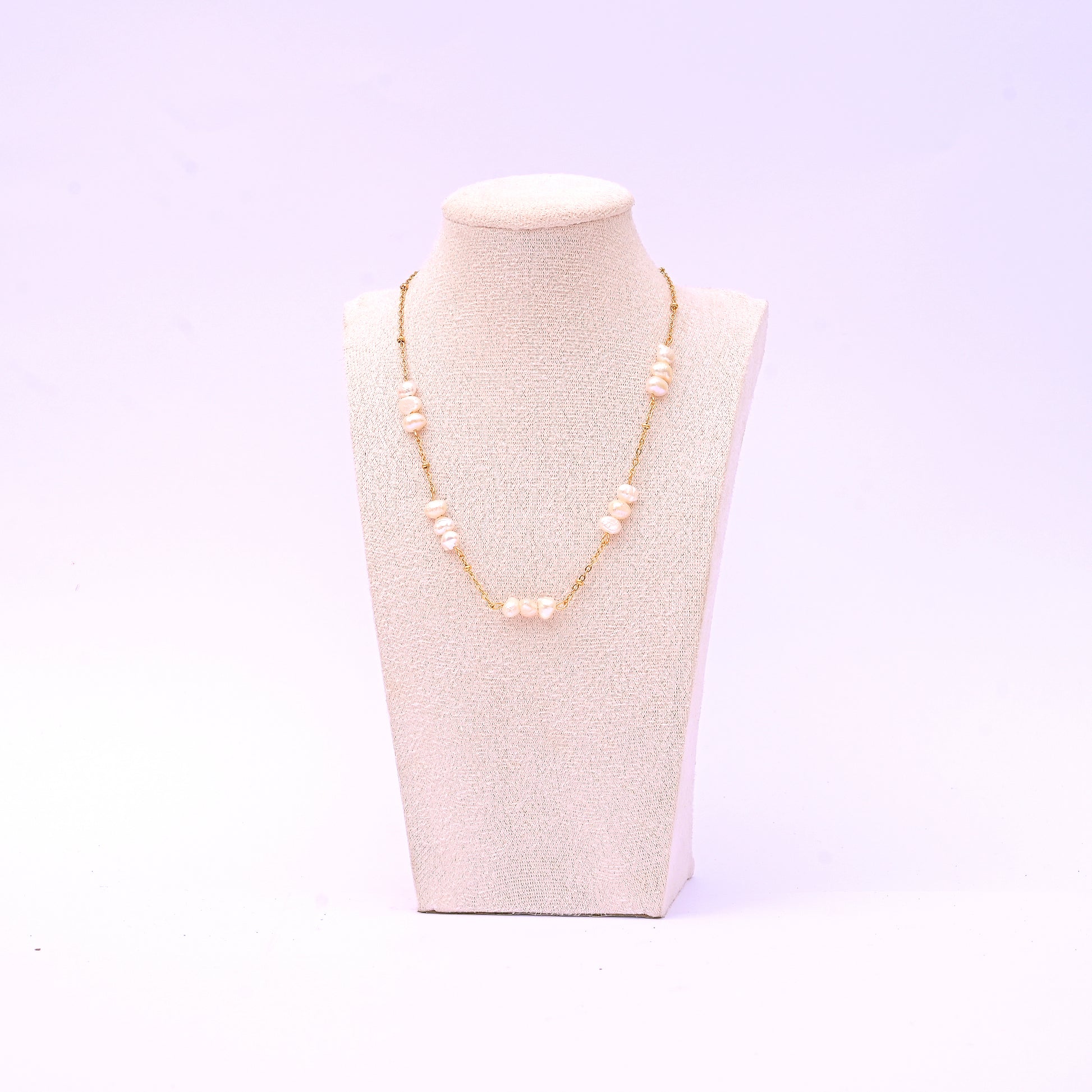 This elegant bracelet/necklace features a pattern of three pearls separated by fine gold-colored stainless steel chains. Thoughtfully designed, it’s tarnish-free — best worn with care.